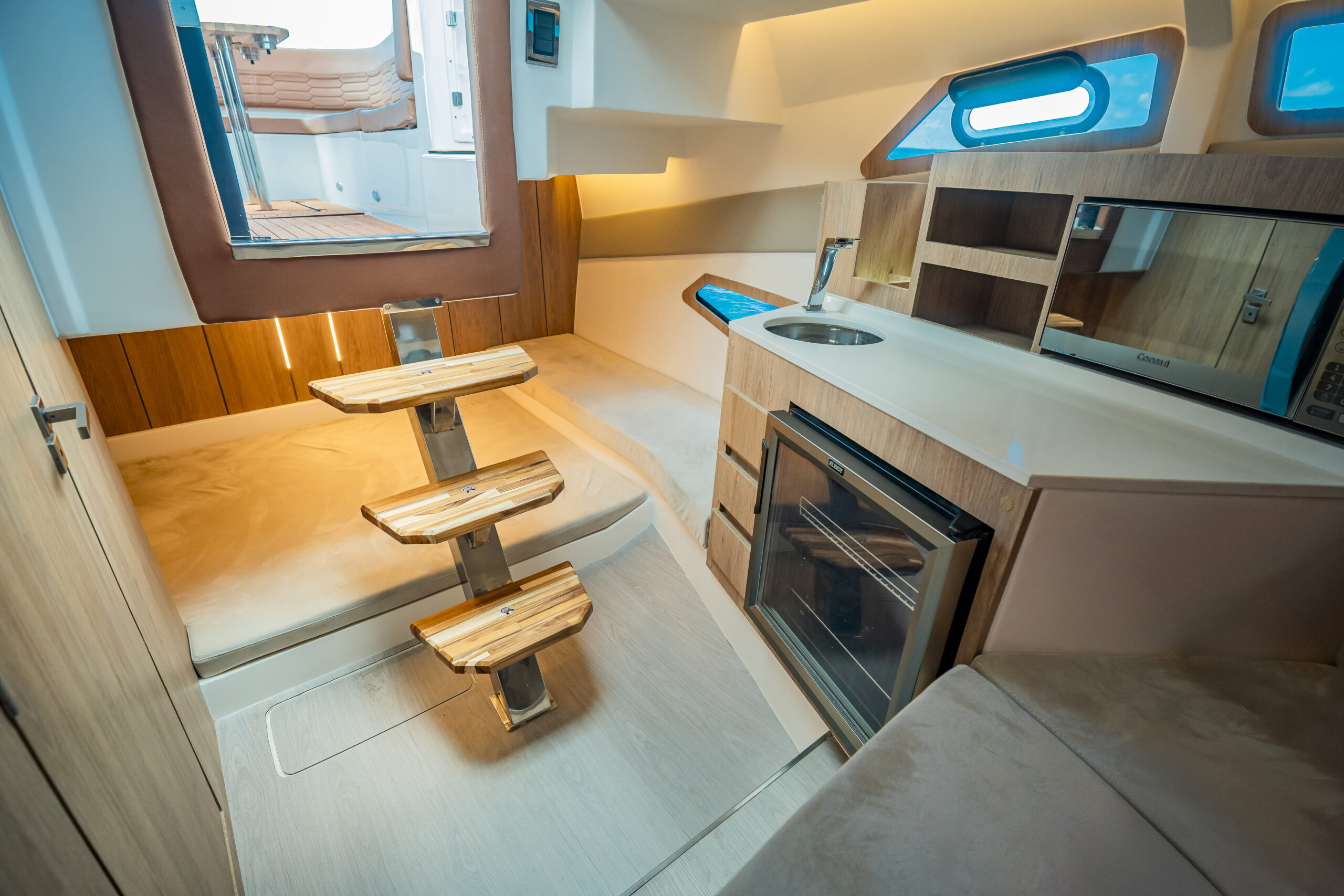 Our manufacturing system includes a laminated hull, deck, and spar, becoming a single piece: the monohull, responsible to make the hull more resistant to the wildest seas and giant waves. In addition, they have a remote activation system for the fire extinguishers located inside the basement, providing greater security for our customers.
