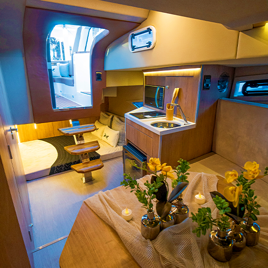 The NX370HT SPORT represents a combination of NX engineering experience with exclusivity and luxury that each of our models offers, providing a unique sailing with a touch of sportiness increased with each throttle touch. A project planned for people who enjoy feeling every inch of strength and freedom the sea may offer.